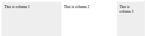<!-- HTML: Flex container with 3 columns of equal widths --> <div class="flexcontainer"> <div class="columns">This is column 1</div> <div class="columns">This is column 2</div> <div class="columns">This is column 3</div> </div>